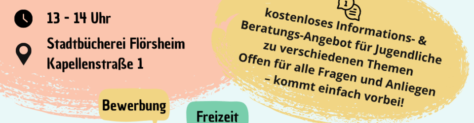 Jeden dritten Dienstag im Monat findet eine Jugendinfo-Sprechstunde von 13-14 Uhr mit mobflo in der Stadtbücherei Flörsheim statt. Die Sprechstunde ist ein kostenloses Angebot für Jugendliche. Ihr könnt euch zu Themen wie Schule, Bewerbung, Freizeit oder Auslandsaufenthalte informieren und beraten lassen.
