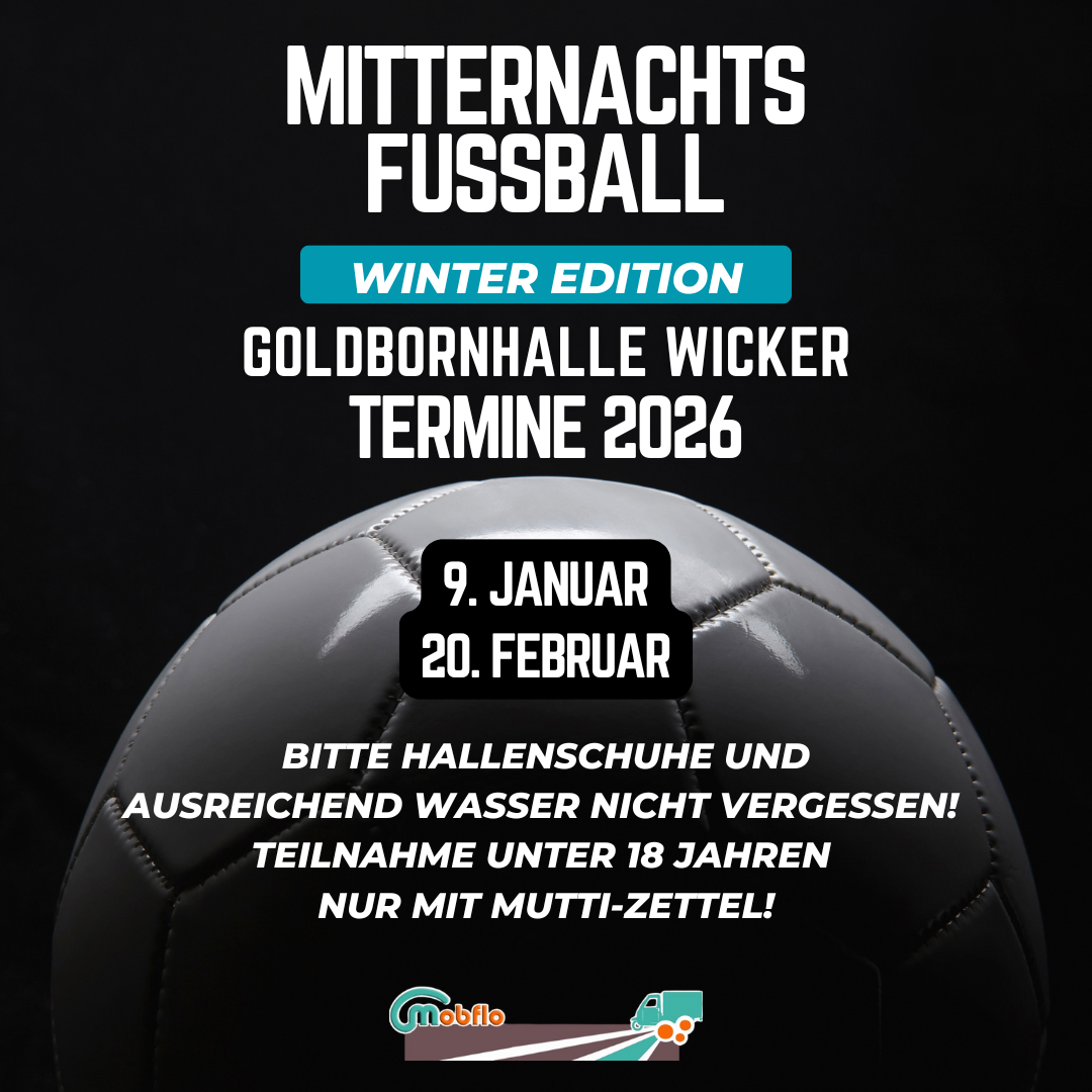 Unser Mitternachtssport findet im Januar wie immer in der Goldbornhalle in Wicker von 22-1 Uhr statt.