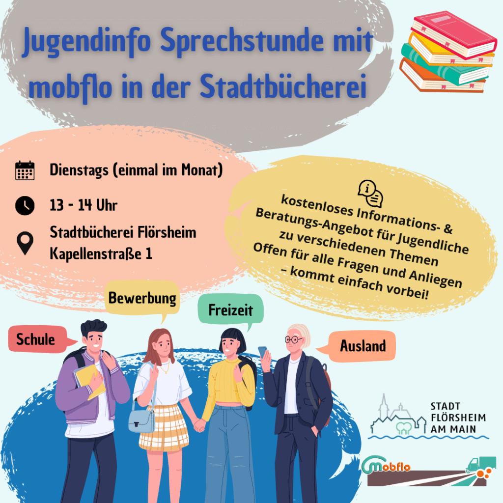 Wir freuen uns sehr, eine neue Kooperation mit der Stadtbücherei Flörsheim bekannt geben zu dürfen! Ab sofort findet dort einmal im Monat (dienstags) unsere Jugendinfo-Sprechstunde für Schüler*innen statt.